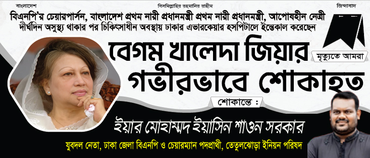 বিএনপি চেয়ারপারসন ও তিনবারের সাবেক প্রধানমন্ত্রী বেগম খালেদা জিয়ার মৃত্যুতে গভীর শোক প্রকাশ করেছেন ঢাকা জেলা যুবদলের নেতা এবং তেঁতুলঝোড়া ইউনিয়ন পরিষদের চেয়ারম্যান পদপ্রার্থী ইয়ার মোহাম্মদ ইয়াসিন শাওন সরকার।